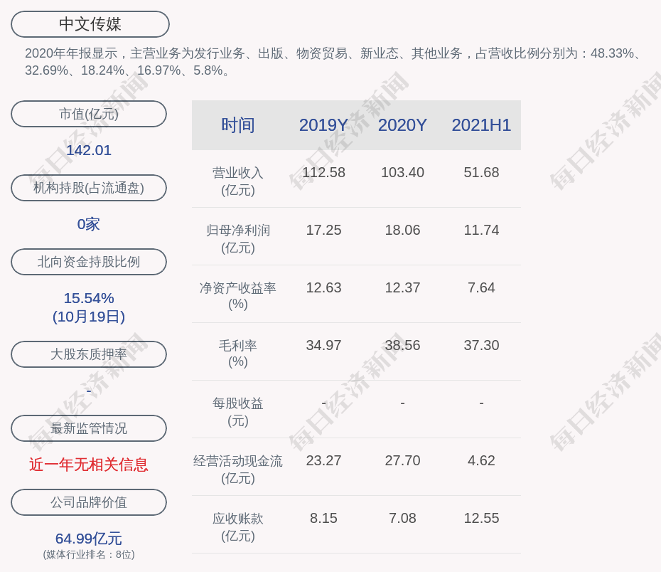 2020年年报显示,中文传媒的主营业务为发行业务、出版、物资贸易、新业态、其他业务,占营收比例分别为:48.33%、32.69%、18.24%、16.97%、5.8%。