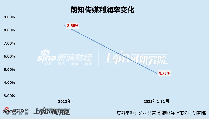 由于报告期不同无法同比判断,但是从利润率来看,2023年朗知传媒的净利率大幅下滑,并且处于较低水平。2022年朗知传媒的利润率为8.36%,2023年前11个月期利润率即下降为4.73%,盈利能力较弱。