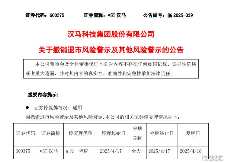 4月16日晚间,*ST汉马(600375)发布公告称,上海证券交易所于 4月16日同意公司撤销退市风险警示及其他风险警示。公司股票将于4月17日开市起停牌一天, 4月18日(星期五)开市起复牌。