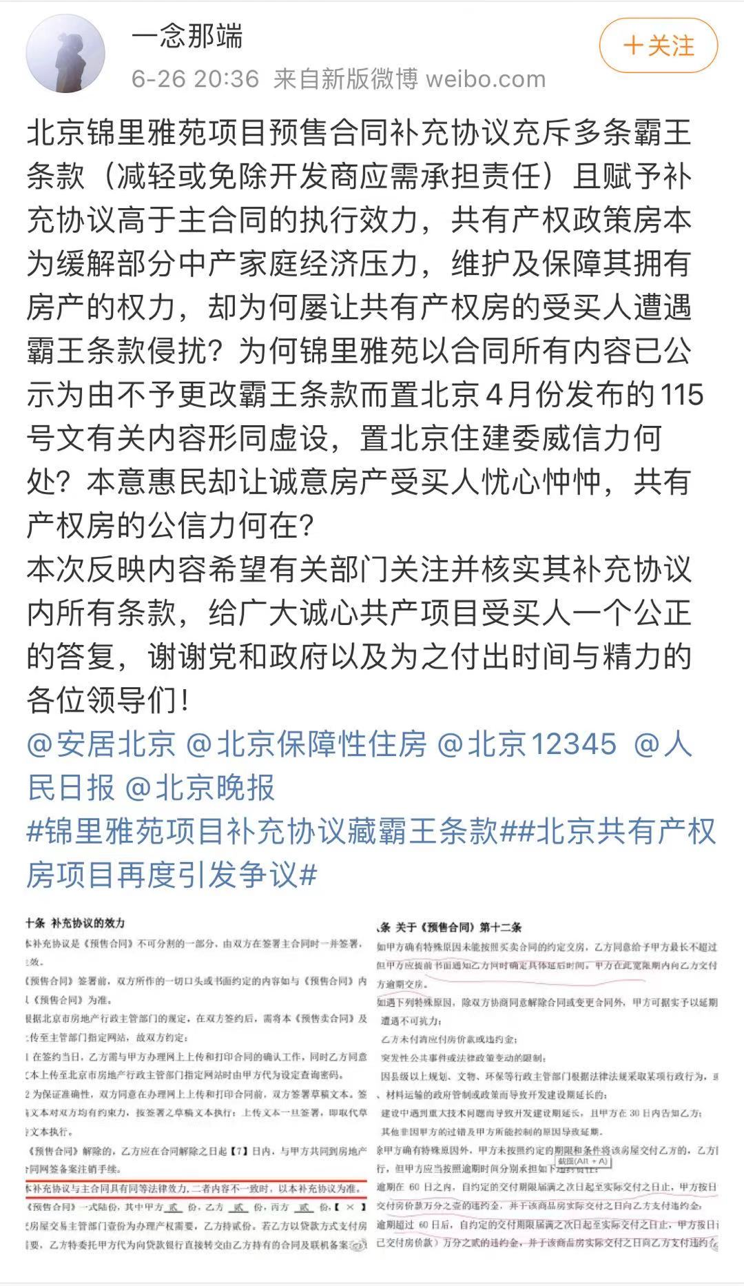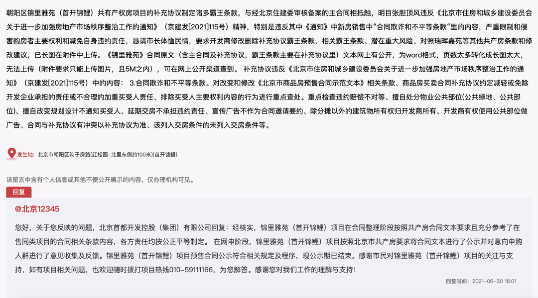 首开集团公开回复表示,在网申阶段,首开锦鲤(锦里雅苑)项目按照北京市共有产权房要求将合同文本进行了公示并对意向申购人群进行了意见收集及反馈。首开锦鲤(锦里雅苑)项目预售合同公示符合相关规定及程序,现公示期已结束。关于市民提出的“霸王条款”,预售合同及补充协议中包含逾期交付时开发商违约责任、房屋权利状况与主合同约定不符时开发商违约责任等开发商的违约责任,并非仅约定了购房者责任,开发商应根据合同约定及法律承担违约责任。