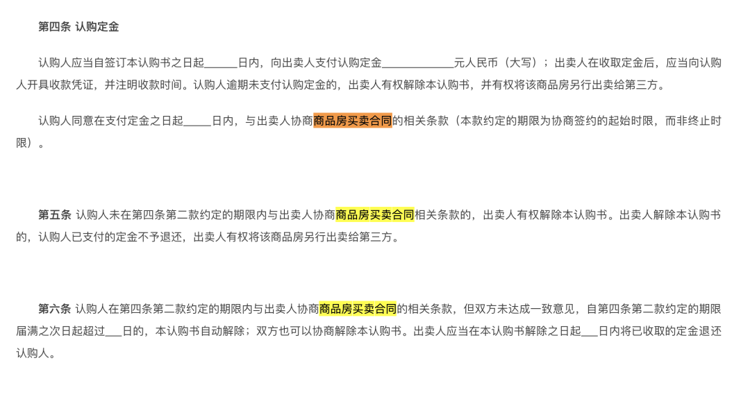 而《红周刊》记者在北京市市场监督管理局官网获取的一份《北京市商品房认购书》范本在谈及认购定金时表示,在一定期限内,认购人与出卖人协商商品房买卖合同的相关条款,但双方未达成一致意见,认购书自动解除,出卖人应当在一定期限内退还定金。