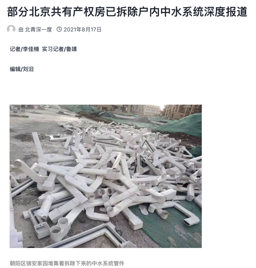据北京青年报旗下的“北青深一度”8月报道显示,锦安家园堆集着拆除下来的中水系统管道。而按照原计划,锦安家园预计于2021年11月整体交房,距今仅有不到3个月时间。毫无疑问,中水系统管道的拆除以及重新改为传统排水模式,在一定程度上会增加锦安家园的按期交房难度。