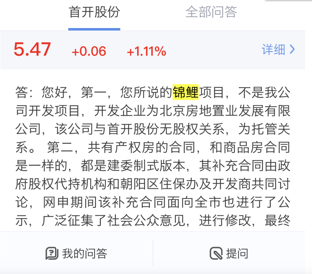 而关于这一问题,《红周刊》记者注意到,早在6月,就有投资者向上市公司首开股份提出疑问。彼时,首开股份回复表示,“锦鲤项目不是我公司开发项目,开发企业为北京房地置业发展有限公司,该公司与首开股份无股权关系,为托管关系”。
