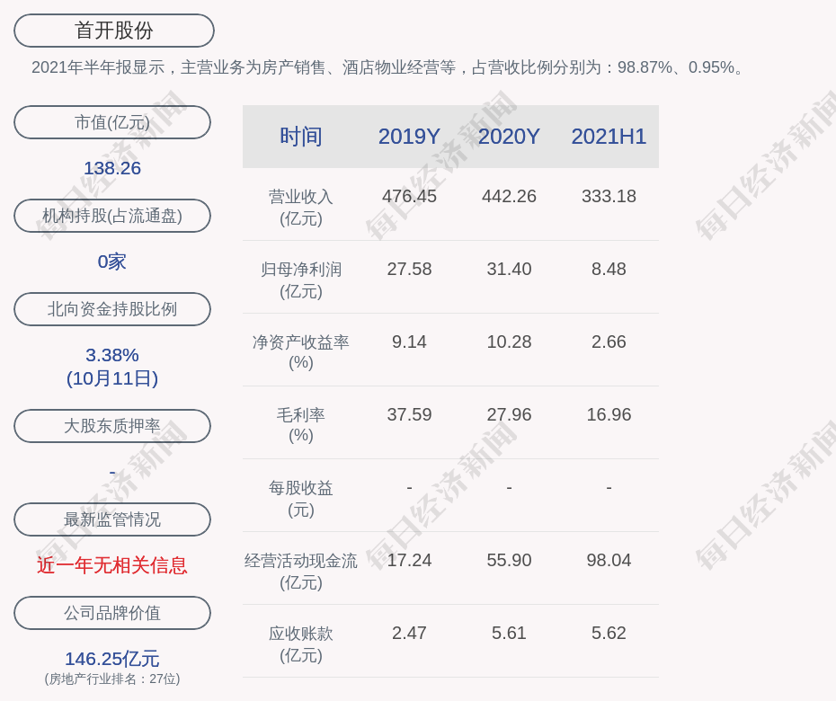 2021年半年报显示,首开股份的主营业务为房产销售、酒店物业经营等,占营收比例分别为:98.87%、0.95%。