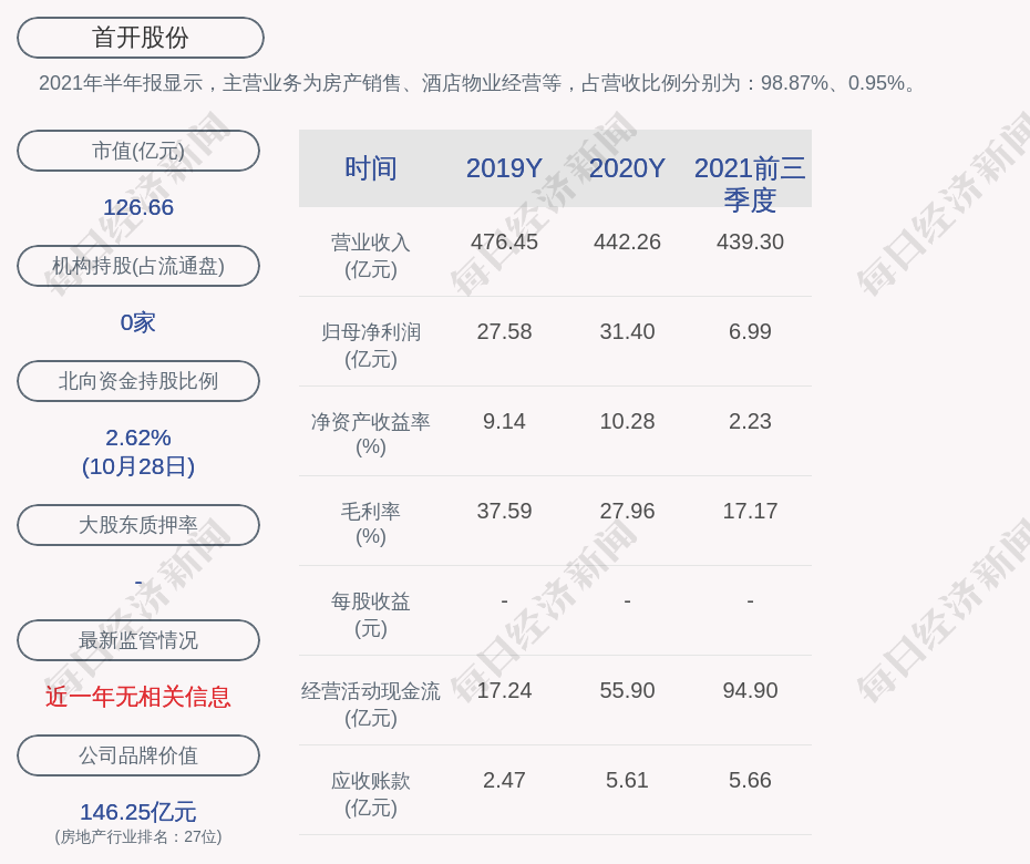 2021年半年报显示,首开股份的主营业务为房产销售、酒店物业经营等,占营收比例分别为:98.87%、0.95%。