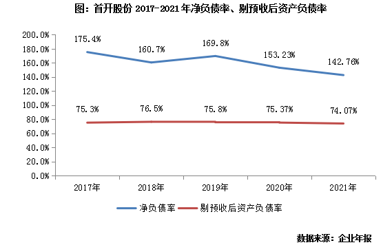 【处于橙档水平,债务结构仍有待优化】2021年全年首开股份持有现金314.0亿元,同比下降11.68%。现金短债比1.51,较2020年上升0.1个百分点,长短债务比4.9,同比上升0.77。净负债率142.76%,相比2020年下降10.47个百分点。剔除预收账款后资产负债率为74.07%,较上年下降1.3个百分点。净负债率和剔预收后资产负债率虽然有一定改善,但是仍然踩线,处于橙档。