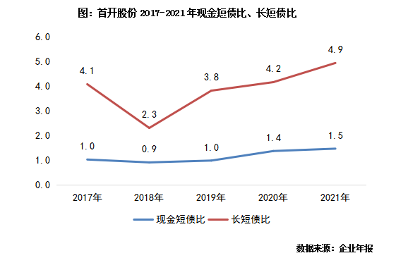 债务结构持续改善。2021年全年首开股份持有现金314.0亿元,同比下降11.68%。现金短债比1.53,较2020年上升0.1个百分点,长短债务比4.9,同比上升0.77。现金短债比持续达标,债务结构持续改善,短期偿债风险较低。