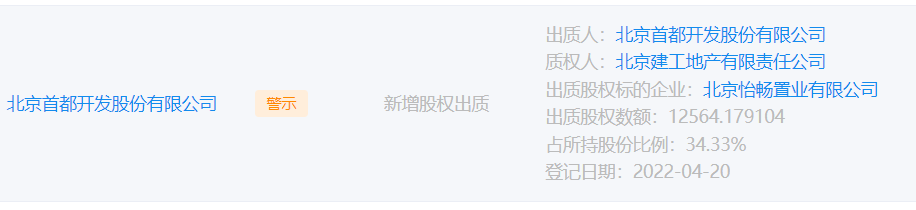 4月20日,北京首都开发股份有限公司登记质押北京怡畅置业有限公司11.5%股权予北京建工地产有限责任公司。质押股份占所持股份比例为34.33%,出质股权数额为12564.179万元。