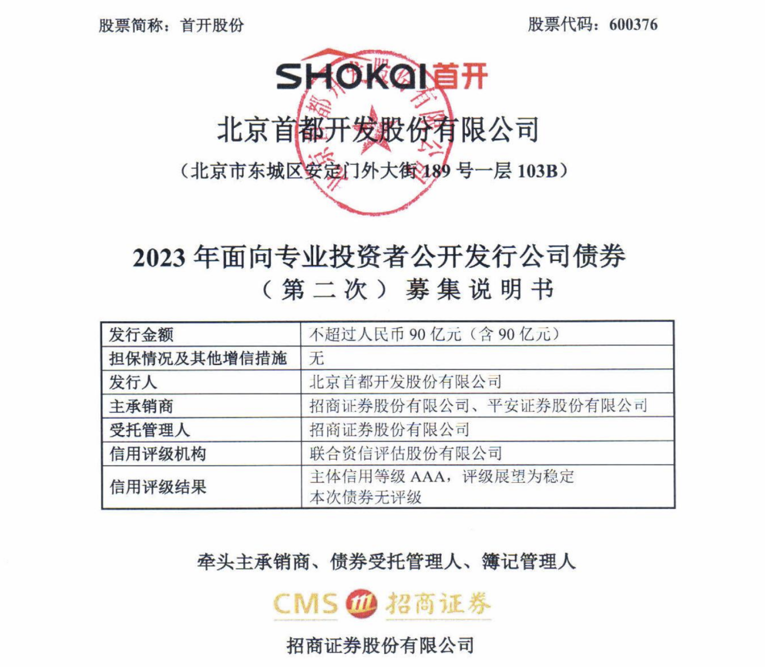 债券类别为小公募,拟发行金额90亿元,发行人为北京首都开发股份有限公司,承销商/管理人为招商证券股份有限公司、平安证券股份有限公司。