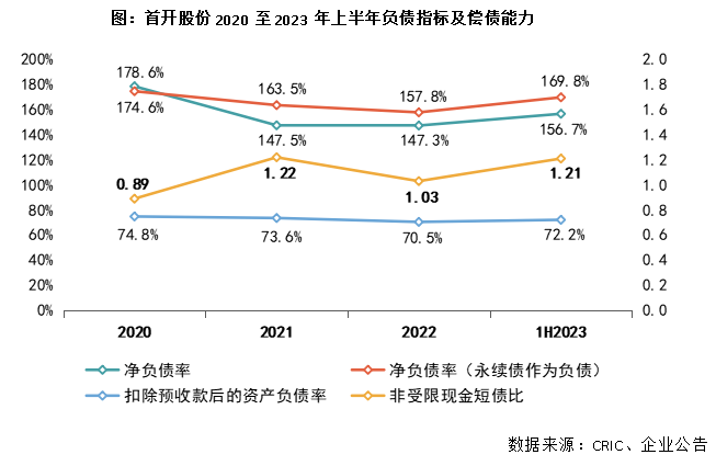 截至2023年上半年末,首开股份持有现金229.1亿元,较2022末增加23.7亿元,其中受限及预售监管资金58亿元、非受限现金171.1亿元。非受限现金短债比1.21倍、长短期债务比5.64倍,保持在安全范围。净负债率156.7%、永续债作负债的净负债率169.8%、剔除预收账款后的资产负债率72.2%,较2022年末有所提升,仍需进一步优化以达到监管要求。