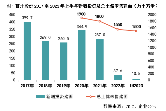 2023年上半年,行业流动性压力持续,规模房企整体投资意愿延续低迷、投资态度谨慎。首开股份的投资力度也收缩明显,新增投资规模保持在低位。上半年,首开股份以底价获取北京市昌平区南邵镇一宗纯商品住宅地块,地上建筑规模10.82万平方米。从未来可售资源来看,截至上半年末,首开股份总土储未售建面近1500万平方米,总土储规模保持相对充裕。