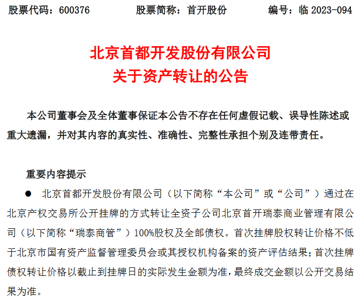 10月27日晚间,首开股份发布公告称,拟通过在北京产权交易所公开挂牌的方式,转让北京首开瑞泰商业管理有限公司100%股权及全部债权。