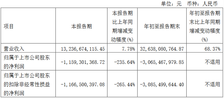 首开股份前三季度营业收入326.4亿元,同比增长68.37%;净利润亏损30.65亿元。