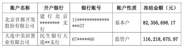 具体来看,首开股份被冻结金额为8235.67万元,而大连中美居置业有限公司被冻结金额为11621.87万元,两个账户被冻结资金共约1.9857亿元。
