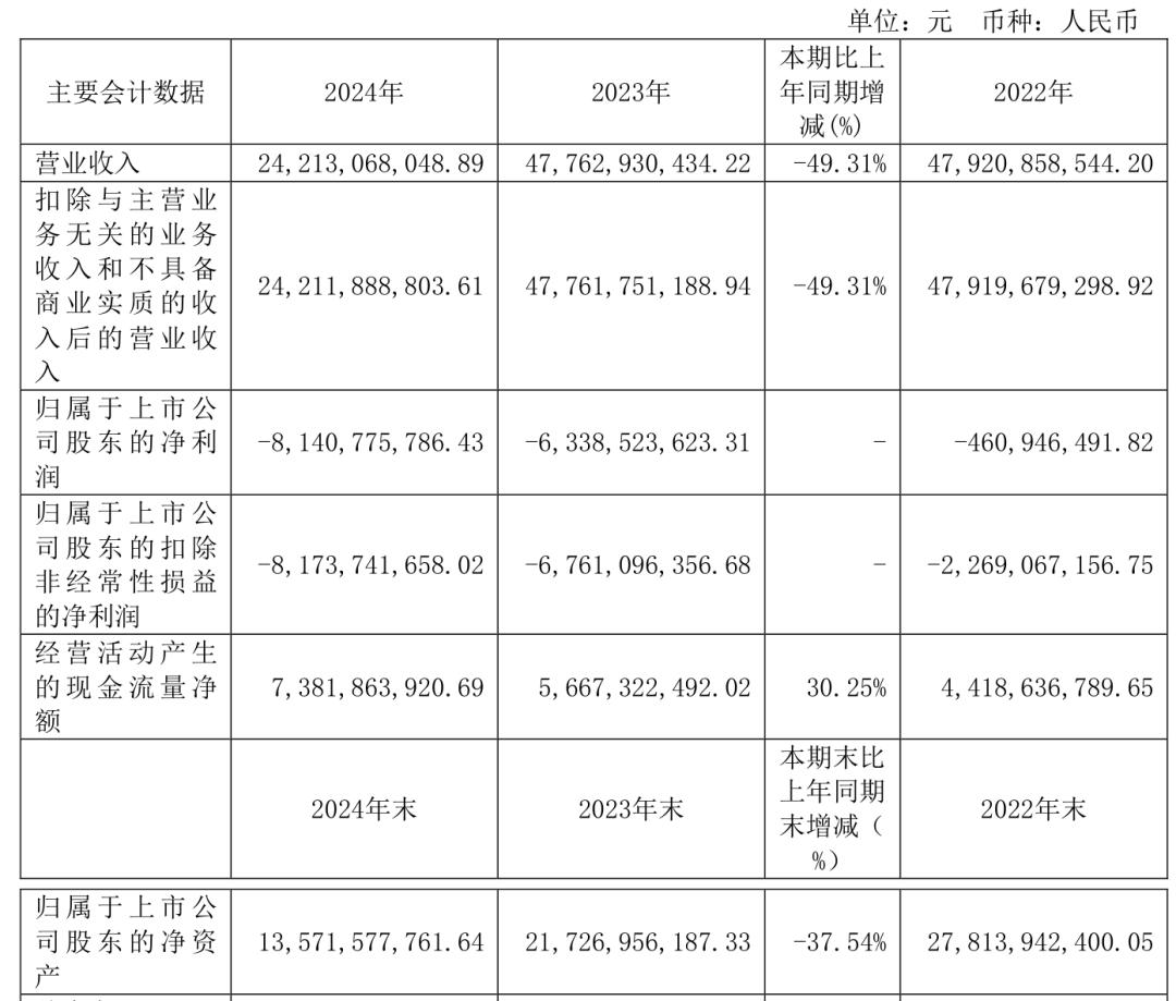 财务状况同样令人堪忧。2024年,公司营业收入242.13亿元,同比下降49.31%,已连续三年下滑;归属母公司净利润亏损81.41亿元,同比扩大28.43%,也是连续三年呈现负数。