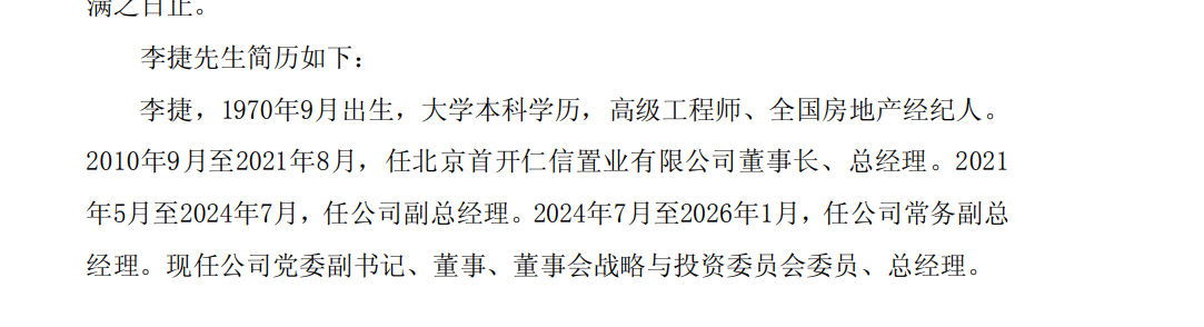 同时,经首开股份董事长李岩提名推荐,公司第十届董事会提名、薪酬与考核委员会审查,董事会同意聘任李捷为公司总经理。