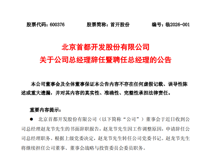 公告显示,赵龙节因工作调整原因,申请辞任公司总经理职务,转任公司党委书记。他将继续担任公司董事、董事会战略与投资委员会委员职务。