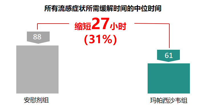 玛帕西沙韦对比安慰剂缩短61.0h(53.0h vs 114.0h),有统计学差异(p 0.01)