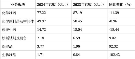 2024年,健康元实现营业收入156.19亿元,较2023年的166.46亿元同比下降6.17%。从业务板块来看,化学制药、原料药及中间体、传统中药等板块营收均有不同程度下滑,而诊断试剂及设备、保健品、生物制品板块实现增长。其中,化学制药板块营收77.22亿元,同比下降11.39%,主要受2023年高基数、产品纳入集采及医保报销价格降低等因素影响;原料药及中间体板块营收49.97亿元,同比下降0.96%,因产品价格下降和市场竞争加剧;传统中药板块营收14.72亿元,同比下降18.44%,源于2023年因疫情和流感季导致的高销售基数,2024年市场需求回归正常。而保健品板块营收3.77亿元,同比增长92.32%,主要得益于利用新媒体平台进行营销,提升了品牌知名度和产品销量。