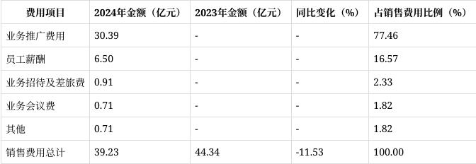 2024年销售费用为39.23亿元,较2023年的44.34亿元同比下降11.53%。公司表示,这主要是由于部分产品纳入集采,以及营销团队精细化管理降本增效所致。从费用构成来看,业务推广费用占比最大,为77.46%,达30.39亿元。