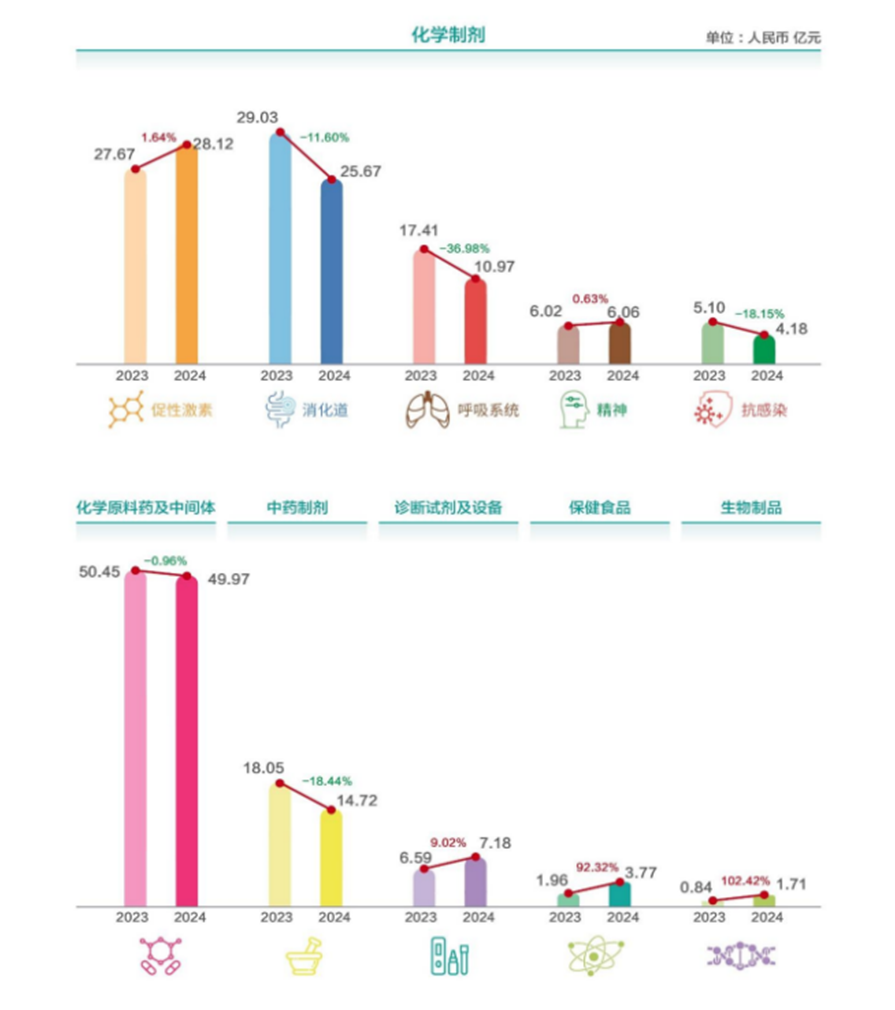 然而,这三大核心业务的业绩正在走下坡路。2024年,化学制剂、中药制剂等传统业务板块收入分别下降11.39%和18.44%,化学原料药及中间体业务同比下降0.96%。