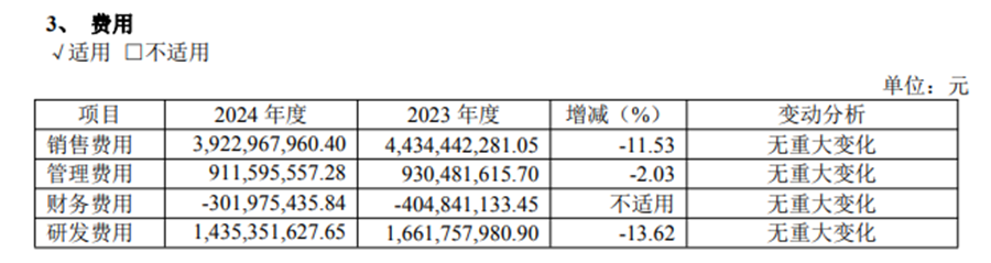 但是从数据来看,2024年,健康元减少了对研发的投入。2024年,健康元的研发费用为14.35亿元,同比减少13.62%。与此同时,健康元的销售费用、管理费用也均降低,2024年降幅分别为11.53%、2.03%。