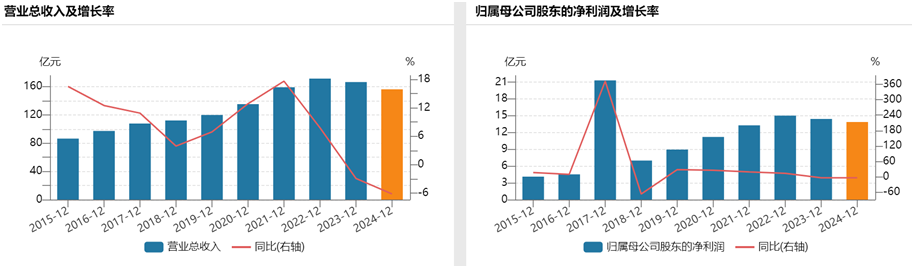 2025年4月7日,健康元药业集团股份有限公司(下称“健康元”,600380.SH)发布了2024年年度报告,2024年,公司实现总营业收入156.19亿元,同比减少6.17%;实现归母净利润13.87亿元,同比减少3.9%。