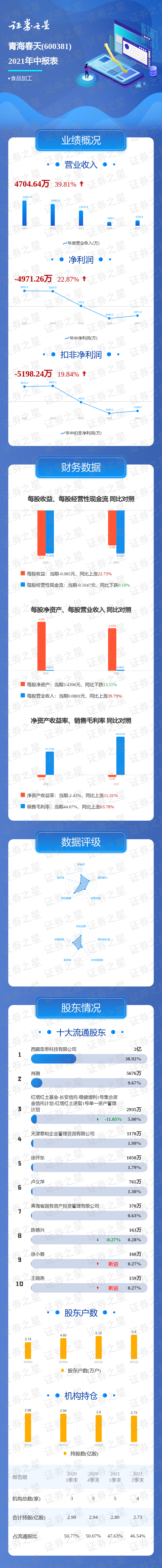 青海春天2021中报显示,公司主营收入4704.64万元,同比上升39.81%;归母净利润-4971.26万元,同比上升22.87%;扣非净利润-5198.24万元,同比上升19.84%;,投资收益-1014.92万元,财务费用9.18万元,毛利率44.67%。