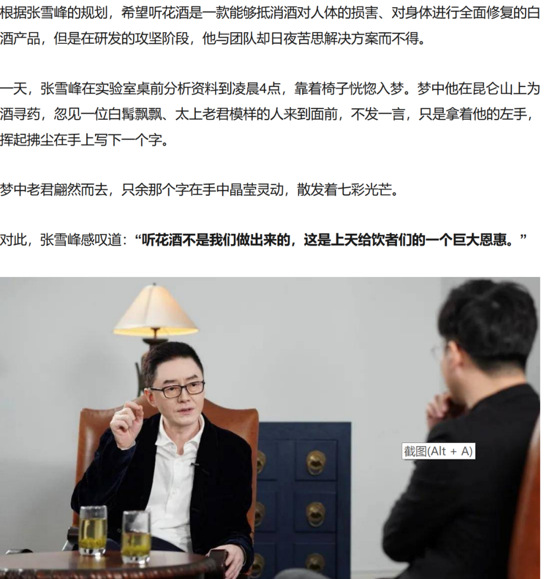 为了讲故事,张雪峰也是无所不用其极。在各大网站上,张雪峰在接受采访时称,他研发的这款酒是一个像太上老君的人在梦中给予启发的。同时,经过他们团队研究发现,喝这款酒还能“提升男性功能”“提高免疫”及“改善睡眠”。