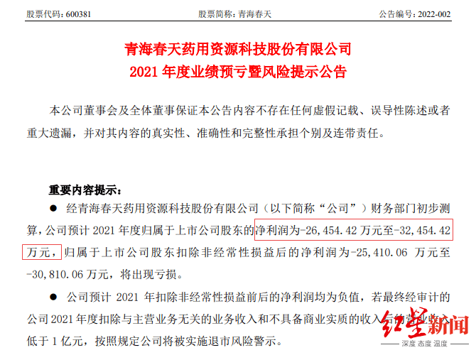 红星资本局注意到,青海春天近日发布的2021年业绩预亏公告称,预计全年实现归属净利润为-2.65亿元到-3.25亿元,扣非净利润为-2.54亿元到-3.08亿元。红星资本局注意到,这已是公司2020年、2021年连续两年巨亏,已经走到了退市边缘。