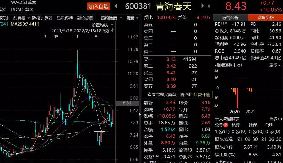 2月15日,有着“虫草第一股”之称的青海春天一改前三个交易日的颓势,盘中涨停。截至当日收盘,报8.43元,涨幅10.05%。