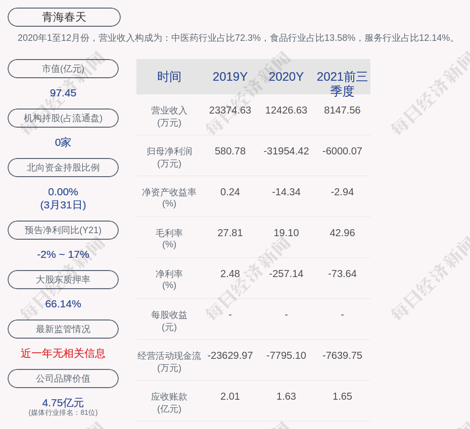 3.青海春天在近3个交易日上涨28.58%,所属食品饮料板块同期上涨5.66%,上证指数同期上涨2.46%。