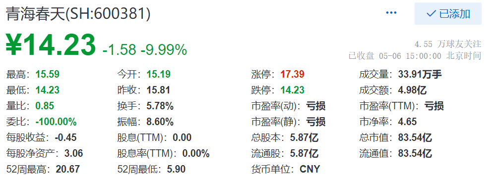 5月6日,截至收盘,青海春天(SH:600381)跌停,跌9.99%,现报14.23元,成交额为4.89亿元,总市值为83.54亿元。