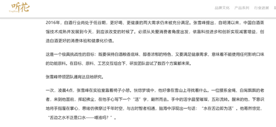 而所谓的听花酒,其研发灵感被董事长张雪峰描述为仙人托梦而来——他趴在实验室的桌上眯了一会,梦到自己在昆仑山找灵丹妙药,一个太上老君模样的人飘过来,在他的左手用拂尘写了个“活”字。醒来之后,张雪峰得到的启发是“水在舌边即为活”,舌边之水为唾液,听花酒最大的特点即生津。这段奇特的灵感来源还被写入听花酒官方介绍的研发历程中。