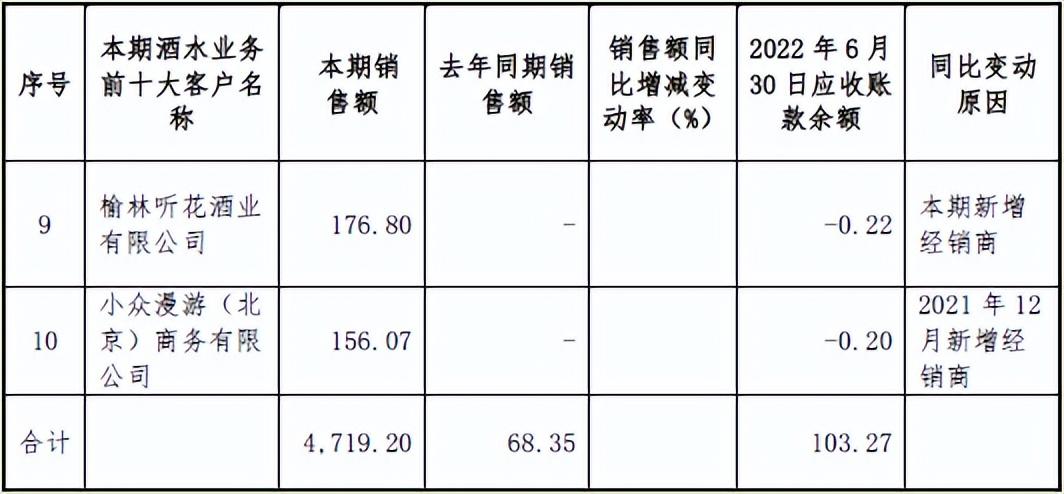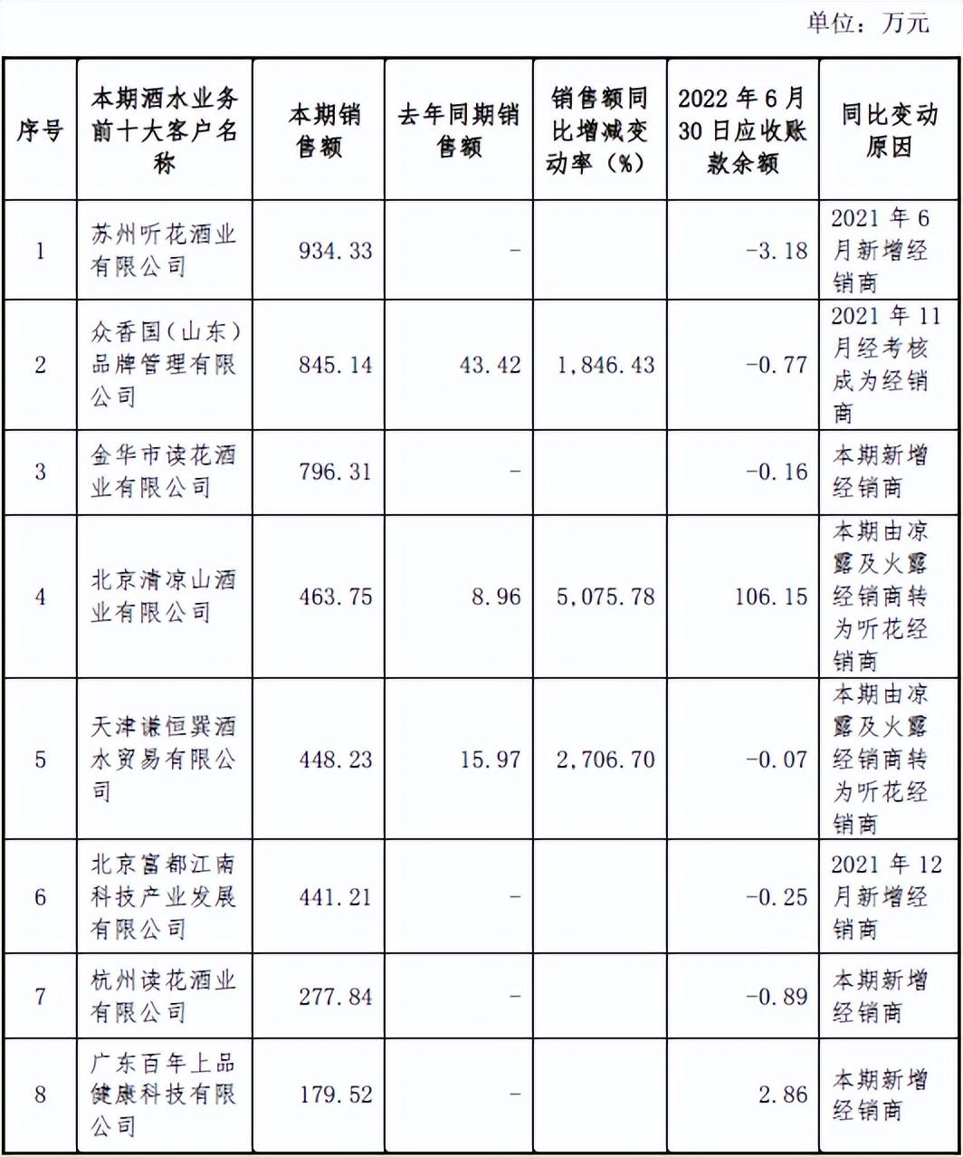 此外,时代数据还发现,在前十大客户中,报告期内新增经销商金华市读花酒业有限公司、杭州读花酒业有限公司、榆林听花酒业有限公司分别成立于2022年3月21日、2022年4月8日和2022年4月26日,均为报告期内成立便迅速成为公司经销商。