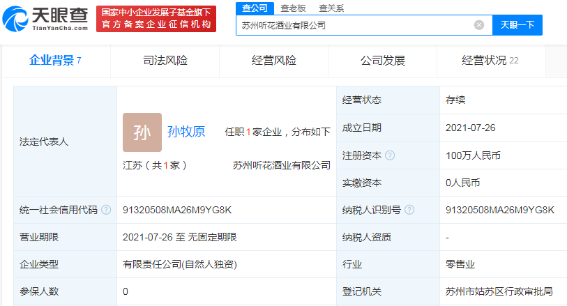 据调查,青海春天披露的2022年上半年酒水业务第一大客户苏州听花酒业有限公司成立于2021年7月26日,注册资本为100万元,实缴资本为0元。
