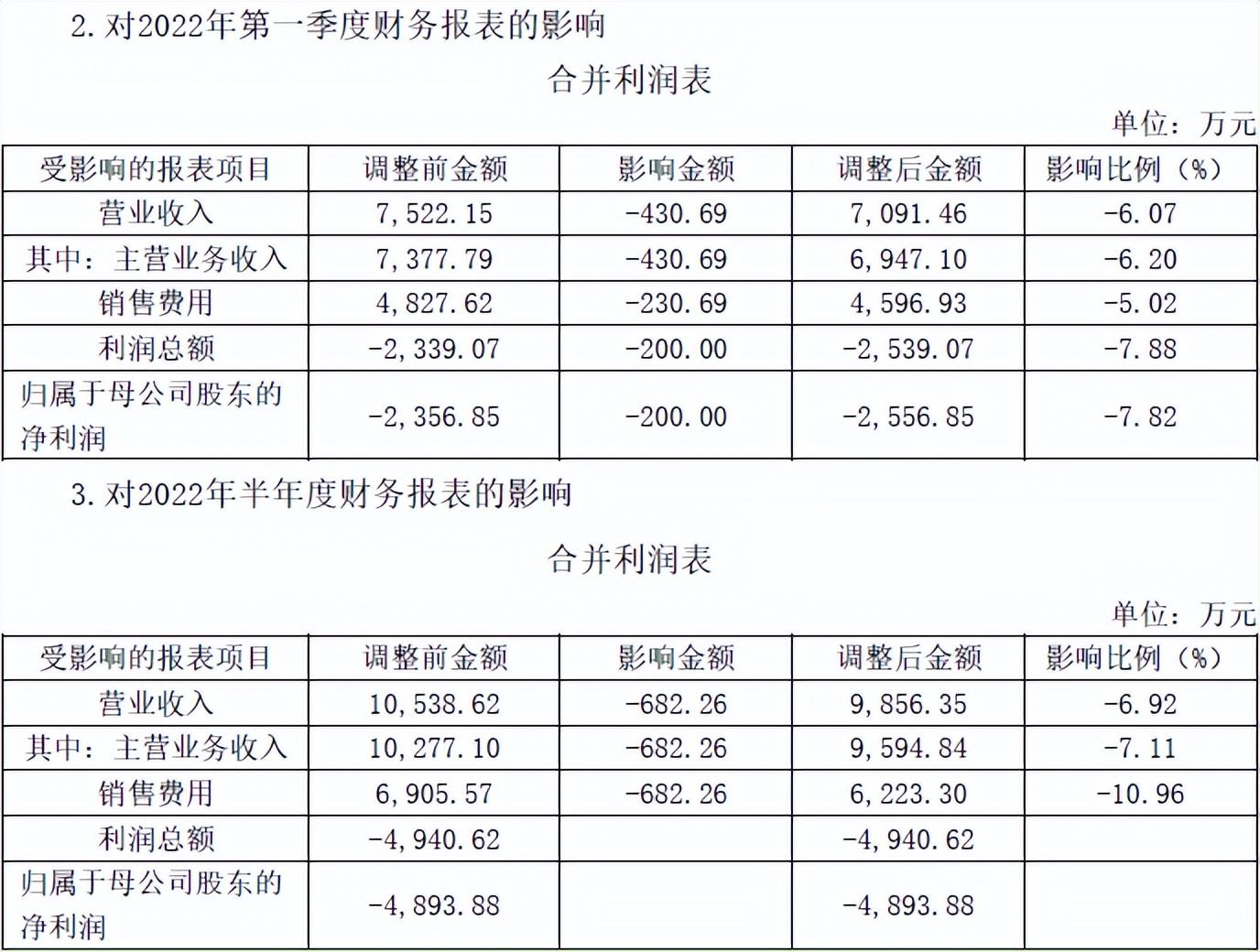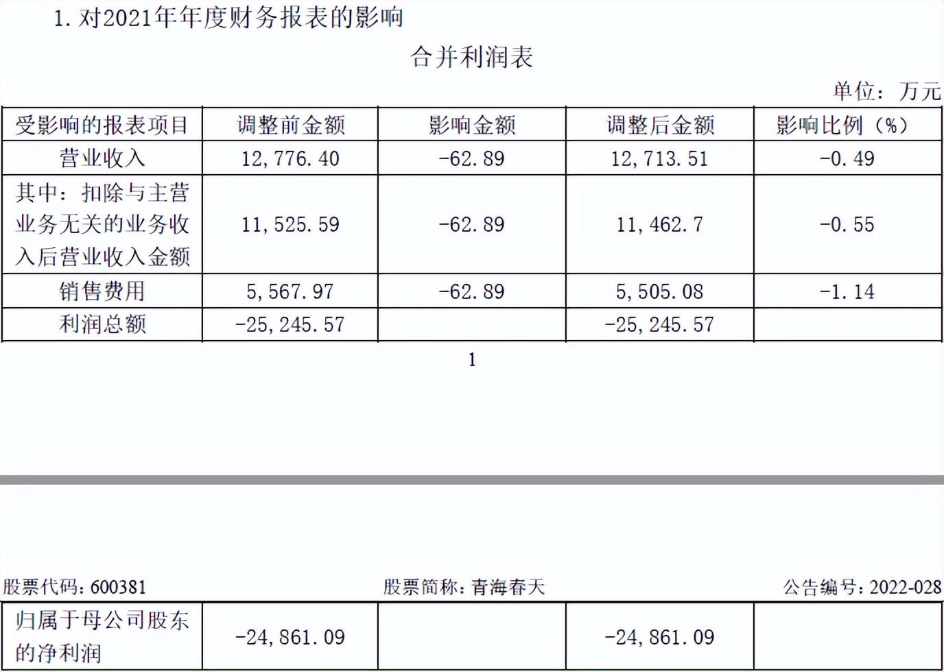 据2022年9月23日公告披露,青海春天存在会计差错,在2022年9月2日收到上交所《关于青海春天药用资源科技股份有限公司2022年半年度报告的信息披露监管问询函》后,经自查发现2022年半年度酒水业务销售费用支付对象中涉及部分经销商。由此导致公司2021年年度财务报表、2022年第一季度财务报表、2022年半年度财务报表中的主营业务收入和销售费用项目分别减少62.89万元、430.69万元、 682.26万元和62.89万元、230.69万元、682.26万元。