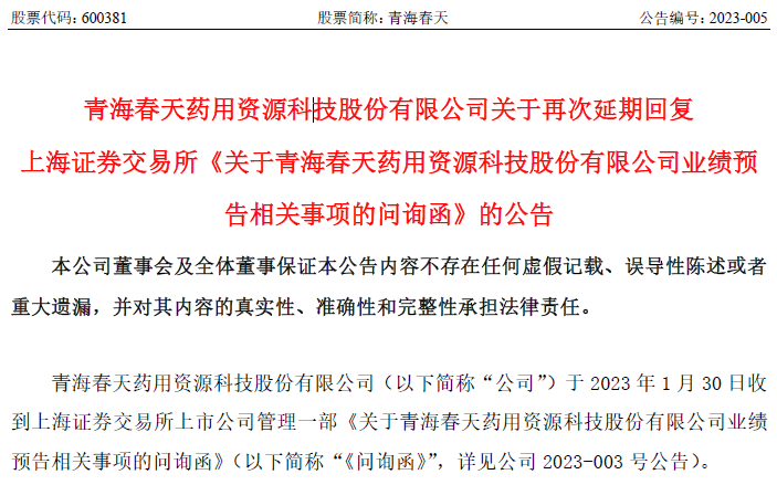 2023年2月7日,青海春天药用资源科技股份有限公司(以下简称“青海春天”)披露了关于延期回复上海证券交易所《关于青海春天业绩预告相关事项的问询函》的公告,称由于《问询函》涉及的内容较多,为确保回复内容的准确和完整,经向上海证券交易所申请延期5个交易日内回复《问询函》,并履行信息披露义务。