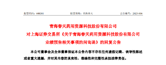 2月20日晚,青海春天药用资源科技股份有限公司(下称“青海春天”)发布公告,回复上交所《关于青海春天业绩预告相关事项的问询函》。