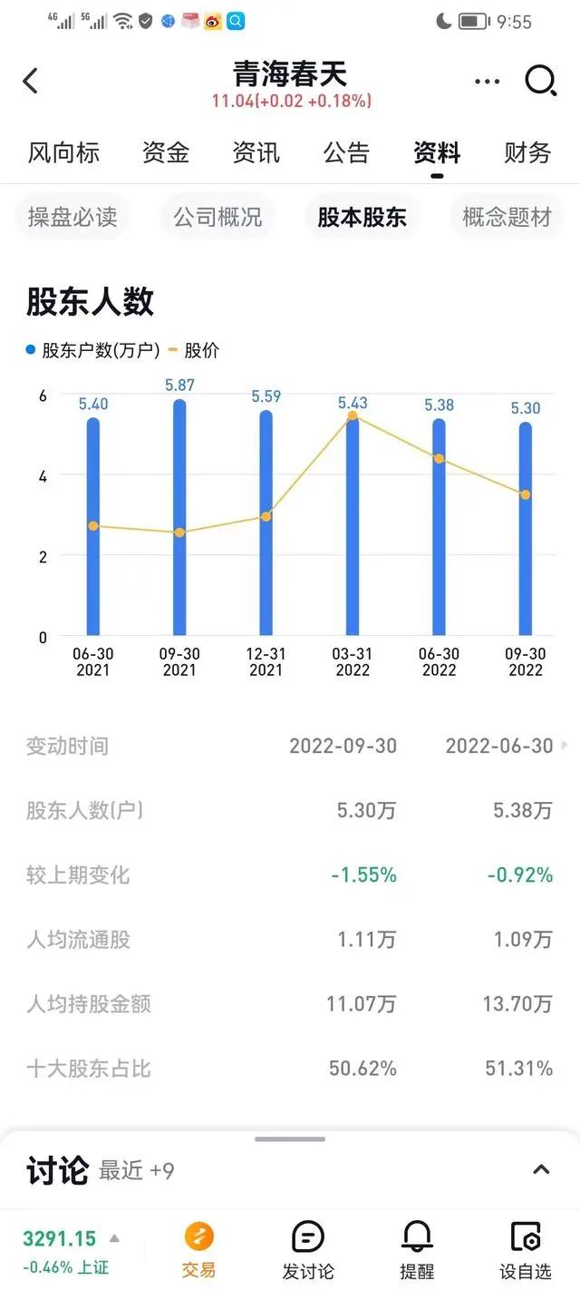 雪球数据显示,2020年9月,青海春天股东总人数3.74万人,2022年3月31日,股东总人数已增长至5.43万人,截止到202年股东人数5.3万人下降1.55%。