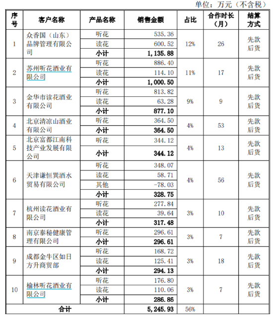 但是我们注意到前十大经销商存在各种错综复杂的关系,比如第二大经销商苏州听花酒业有限公司,这家公司成立于2021年7月,注册资本仅为100万元,实缴资本为0,去年贡献了1000万元的销售额。第三大经销商金华市读花酒业有限公司,成立于2022年3月,注册资金仅10万元,去年贡献了877.1万元销售额。