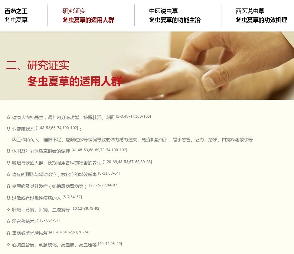 就网站介绍看,冬虫夏草的功效颇为神奇。青海春天官网显示,研究证实冬虫夏草的适用人群包括:健康人滋补养生,调节内分泌功能,补肾壮阳、滋阴;癌症的预防与辅助治疗,放化疗的增效减毒;器官移植术后等。