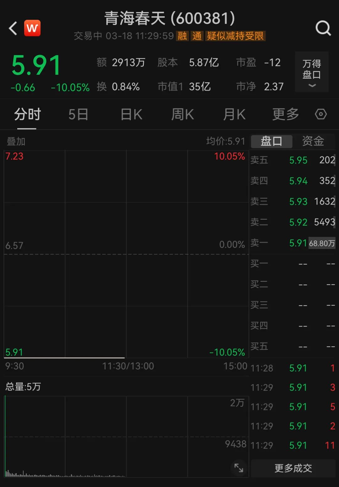 毫无意外,青海春天一字跌停!截至18日午盘,仍有近69万手封单封死跌停,约占公司流通股本的11.72%。