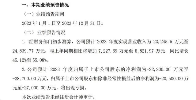 据此前青海春天发布的业绩预告显示,预计2023年度营业收入2.32亿元至2.48亿元,同比增长45.12%至55.08%,2023年度将出现亏损,净利润为-2.22亿元至-2.87亿元,归母扣非净利润为-2.05亿元至-2.70亿元。青海春天已陷入营收增加但利润减少的状态。
