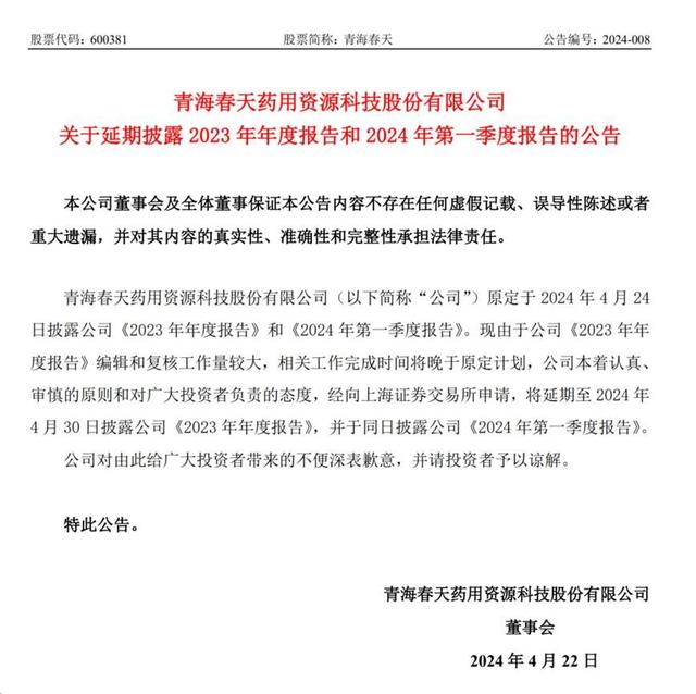 4月22日,青海春天发布了延期披露2023年年度报告和2024年第一季度报告的公告。公告显示:“现由于公司《2023年年度报告》编辑和复核工作量较大,相关工作完成时间将晚于原定计划,经向上海证券交易所申请,将延期至2024年4月30日披露。”