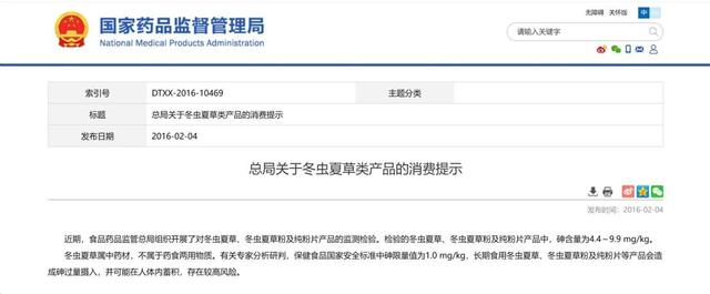 但好景不长,2016年2月4日国家食药监总局在官网发布《关于冬虫夏草类产品的消费提示》指出:“近期组织开展了对冬虫夏草、冬虫夏草粉及纯粉片产品的监测检验,发现相关产品的砷含量为4.4至9.9毫克每公斤。冬虫夏草属中药材,不属于药食两用物质。”