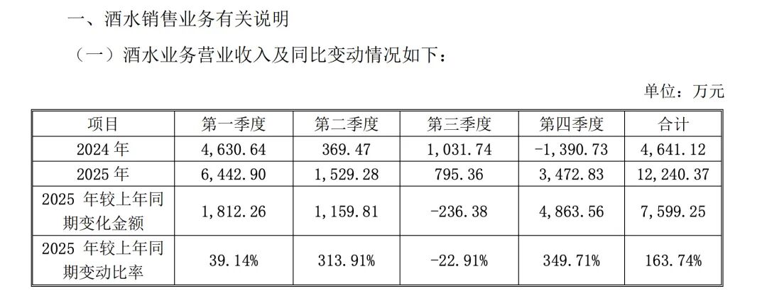 *ST春天对此表示,2025年公司酒水业务全年营收约1.22亿元,同比增长164%,其中第四季度收入近0.35亿元,增速超349%,这并非经营业绩的实质跃升,而是基数低。