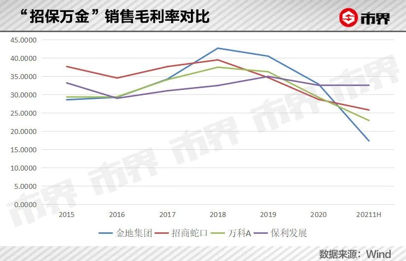 就销售毛利率而言,不仅金地在下滑,老牌稳健型企业代表“招保万金”均是如此。