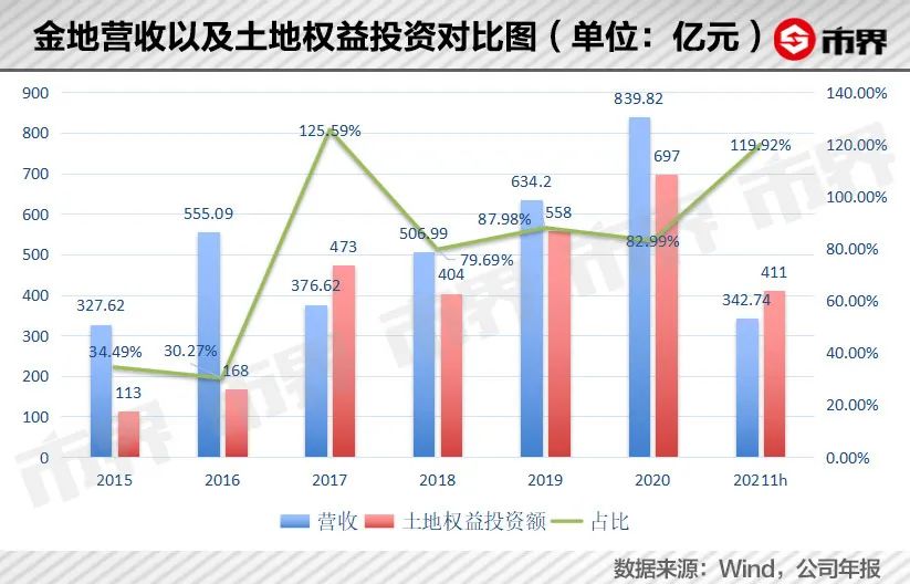 总体来看,金地的土地权益投资额占营收的比例非常高,有时甚至会超过当年的营收。