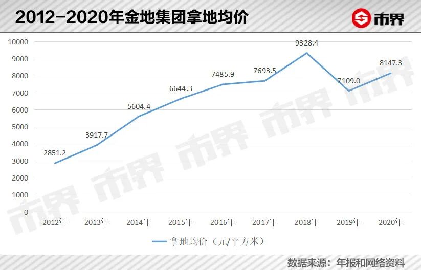 特别是在2019年时,在其他企业暂缓拿地的情况下,金地高价拿了不少地。根据计算,2019年,其拿地均价达到了每平方米9328.4元的历史高价。